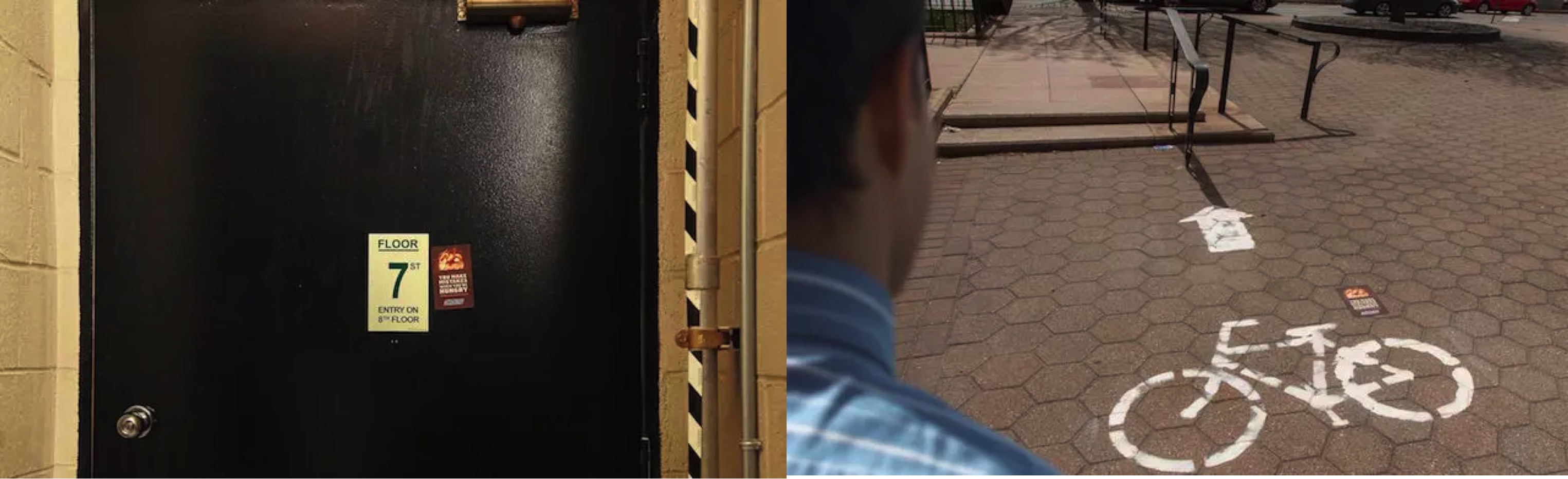 他们在纽约寻找各种出错的小细节,然后在旁边贱兮兮地贴上贴纸,上面写着“You make mistakes when you're hungry.(饿的时候容易出错)”。比如 Williamsburg 一座大楼的入口同时写着“此门进入”和“禁止入内”,地下通道鱼图案的墙砖贴反了头和尾巴。为了这个 campaign,BBDO 纽约在过去几周里找遍了曼哈顿和布鲁克林,就为找到最荒谬搞怪的错误。
