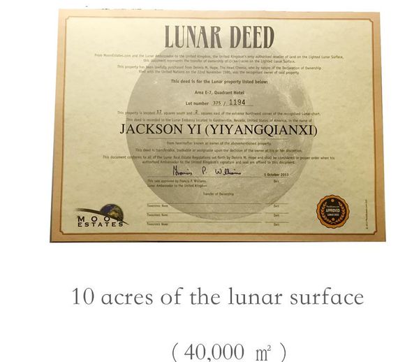 2005年,美国人丹尼斯·霍普开始销售月球上的土地,土地价格为每英亩298元, 如今,霍普已经出售了数亿英亩的月球土地,拥有230万客户,他的客户甚至包括美国前总统卡特、里根、小布什,影星汤姆·汉克斯、尼克·基德曼、汤姆·克鲁斯,易烊千玺也收到了一块面积达40000平方米的月球地皮作为15周岁的生日礼物……