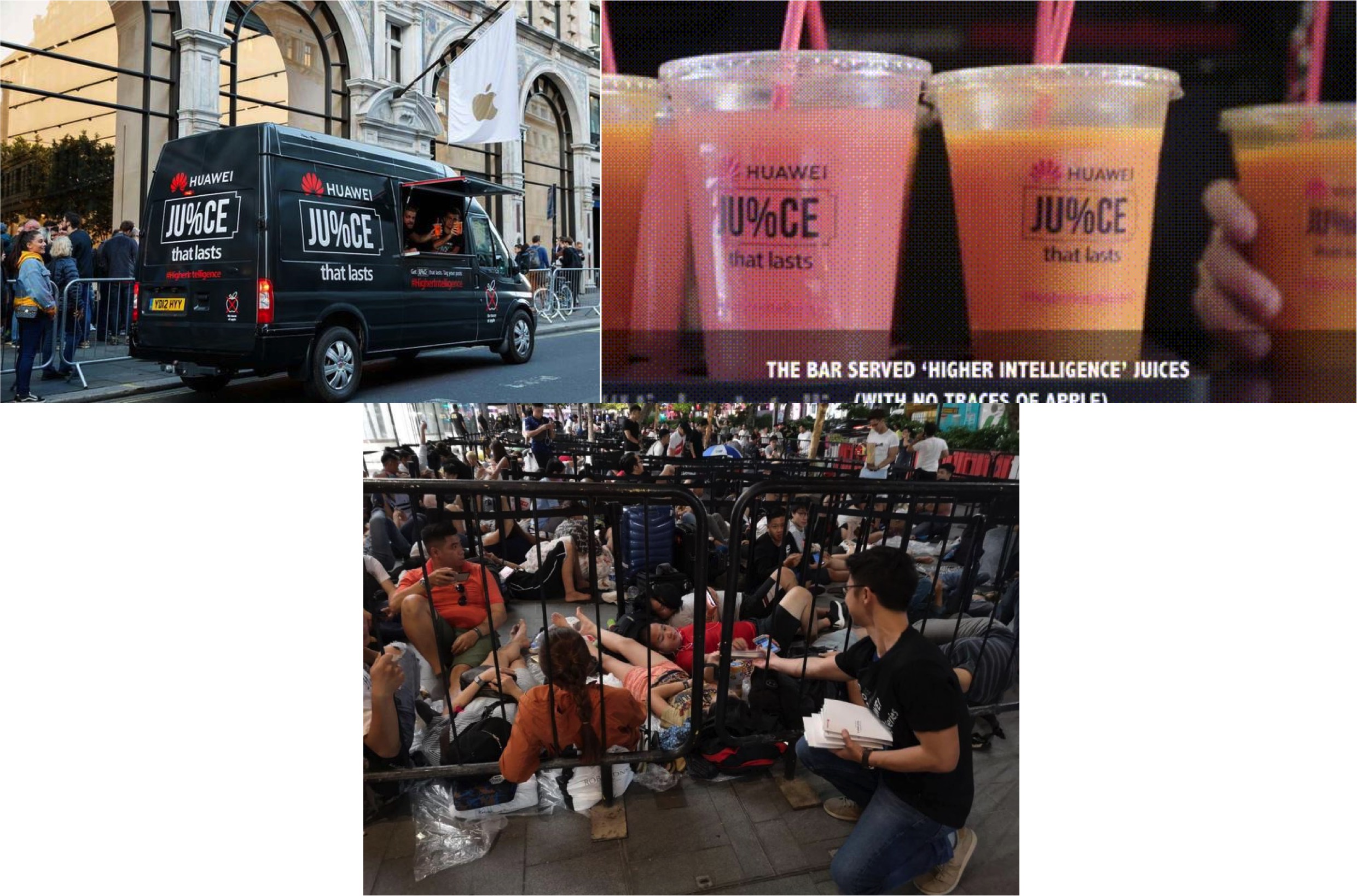苹果XS在伦敦旗舰店的首发日,华为第一个跑去现场制造了冲突:华为为排队的果粉们免费送去了“不含苹果,绝对持久的果汁”和“苹果手机一定用得上的充电宝”