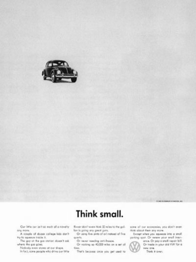20世纪60年代的美国汽车市场是大型车的天下,美国人在享受大车带来的宽敞和舒适之外,也承担了大车带来的高损耗,不环保。乔治·路易斯通过制造和大型车的冲突,创作出了“想想还是小的好”的产品真相,提醒消费者“小”的好处,让那些重视环保的消费者,选择“甲克虫”。