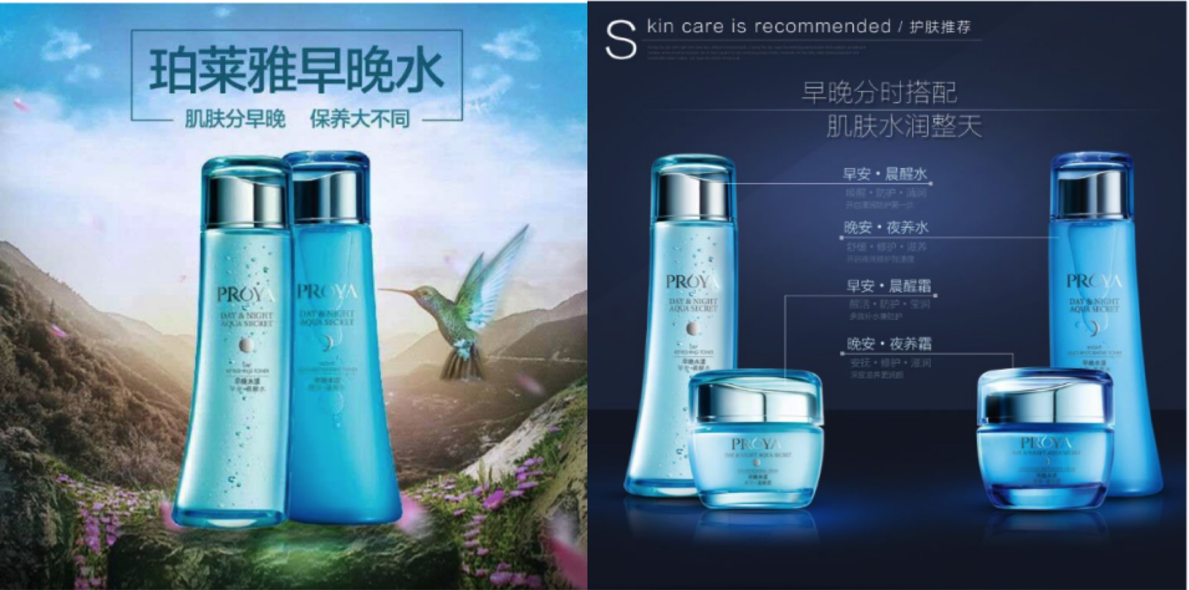 我们制造了“两瓶水比一瓶水更专业的”冲突——将肌肤的需求更科学的分解为白天和夜晚两种不同的需求;将一瓶水更科学的分解为晨水和晚水两瓶水 :