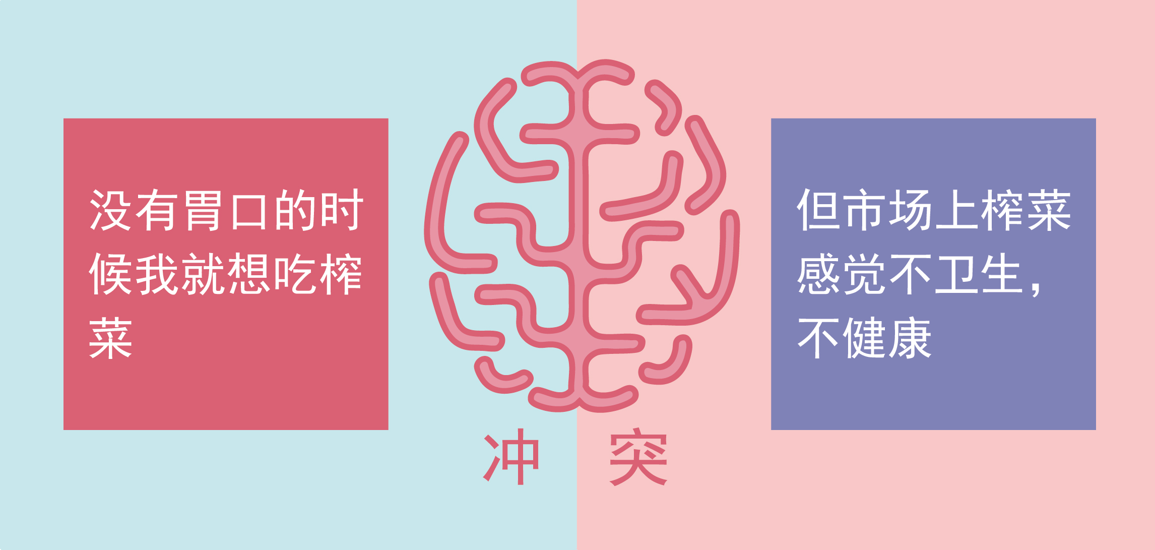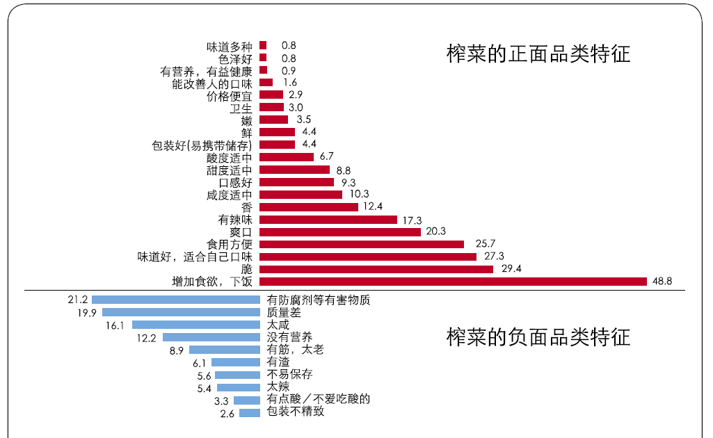 在榨菜产品正面及负面品类特征的调研数据中,大多数消费者为了增加食欲、下饭而购买榨菜,但也有相当大的比例因为有防腐剂、质量差等因素而产生了担心。不可否认的是,榨菜虽然有着广泛的消费者基础,是居家旅行必备的小食,但长久以来榨菜也和低价、低质、不卫生、口味重等等负面因素联系在了一起。消费者对于食用榨菜这件事上,其实是有着显性的冲突: