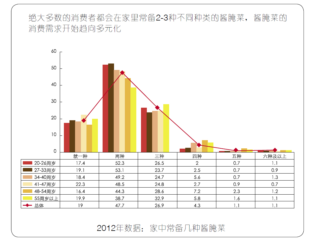 在2012年,绝大多数的消费者都会在家里常备2~3种酱腌菜,这意味着顾客对于酱腌菜的消费需求,已经开始趋向多元化,但除了腐乳、辣酱等少数产品有强势品牌之外,在萝卜干、辣白菜、酱海带、酱菇类等大多数产品市场上还没有强势品牌。酱腌菜当前市场存在的一个冲突是: