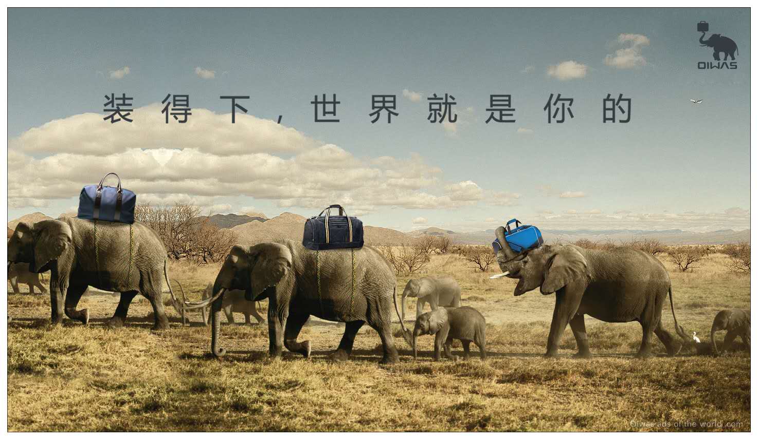 叶茂中冲突战略用大象作为箱包品牌的符号,再动了一个小手术,戏剧化的让大象顶着箱包,成为爱华仕箱包专属的品牌符号。